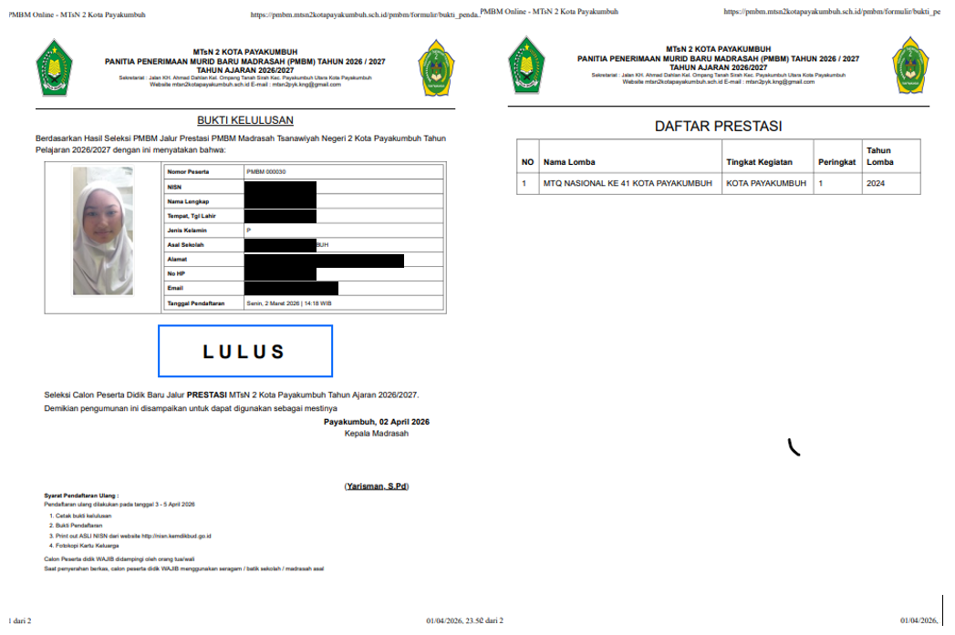 Hasil seleksi Penerimaan Murid Baru Madrasah (PMBM) Jalur Prestasi MTsN 2 Kota Payakumbuh Tahun Ajaran 2026/2027 telah resmi diumumkan.