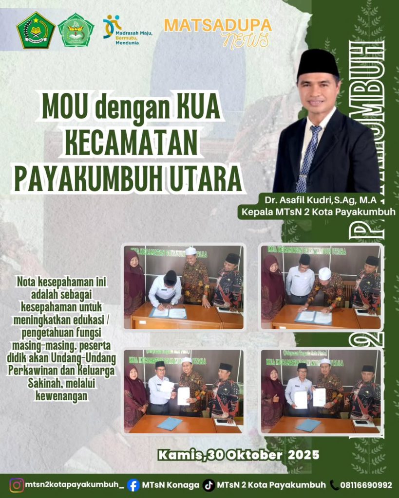 MTsN 2 Kota Payakumbuh secara resmi menjalin Nota Kesepahaman (MoU) dengan Kantor Urusan Agama (KUA) Kecamatan Payakumbuh Utara pada Kamis, 30 Oktober 2025. Kerja sama ini dilaksanakan sebagai upaya bersama dalam meningkatkan edukasi dan pemahaman peserta didik terkait fungsi dan kewenangan masing-masing lembaga. Nota kesepahaman ini bertujuan untuk memberikan pengetahuan dan pemahaman kepada peserta didik […]