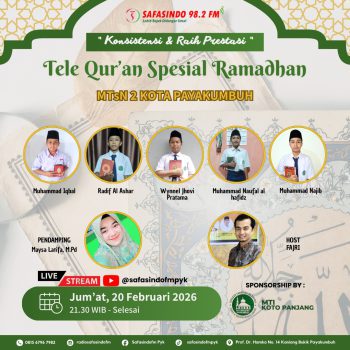 Payakumbuh, 20 Februari 2026 — Memasuki Ramadan 1447 Hijriah tahun 2026, suasana ibadah semakin semarak melalui program “Tele Qur’an Spesial Ramadan” bertema “Konsistensi dan Raih Prestasi” yang disiarkan langsung oleh Radio Safasindo 98,2 FM pada Jumat, 20 Februari 2026 pukul 21.30 WIB hingga selesai, serta disiarkan secara langsung melalui kanal YouTube @safasindofmpyk.
