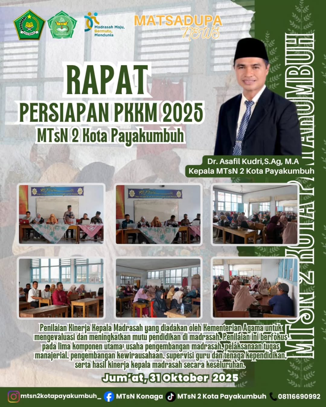 MTsN 2 Kota Payakumbuh melaksanakan Rapat Persiapan Penilaian Kinerja Kepala Madrasah (PKKM) Tahun 2025 pada Jumat, 31 Oktober 2025. Kegiatan ini merupakan bagian dari upaya