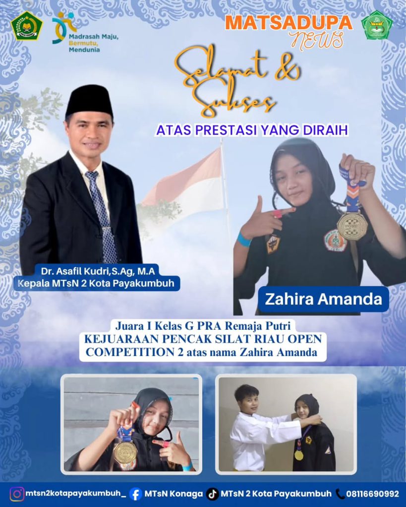 MTsN 2 Kota Payakumbuh kembali menorehkan prestasi yang membanggakan. Selamat dan sukses disampaikan kepada Ananda Zahira Amanda atas prestasi gemilang yang berhasil diraihnya. Capaian ini menjadi bukti nyata bahwa semangat belajar yang tinggi, kedisiplinan, serta kerja keras yang konsisten mampu mengantarkan peserta didik menuju kesuksesan.