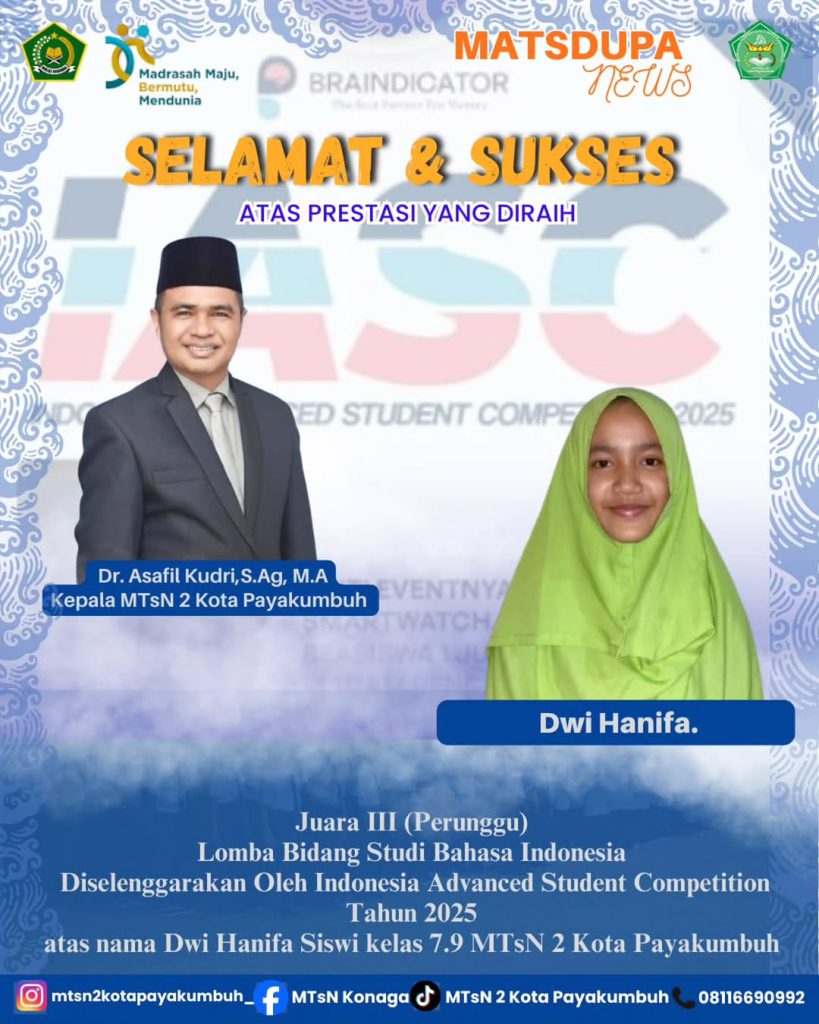 MTsN 2 Kota Payakumbuh kembali menorehkan prestasi yang membanggakan. Salah satu siswi terbaik, ananda Dwi Hanifa, berhasil meraih Juara III (Medali Perunggu) pada Lomba Bidang Studi Bahasa Indonesia yang diselenggarakan oleh Indonesia Advanced Student Competition (IASC) Tahun 2025.