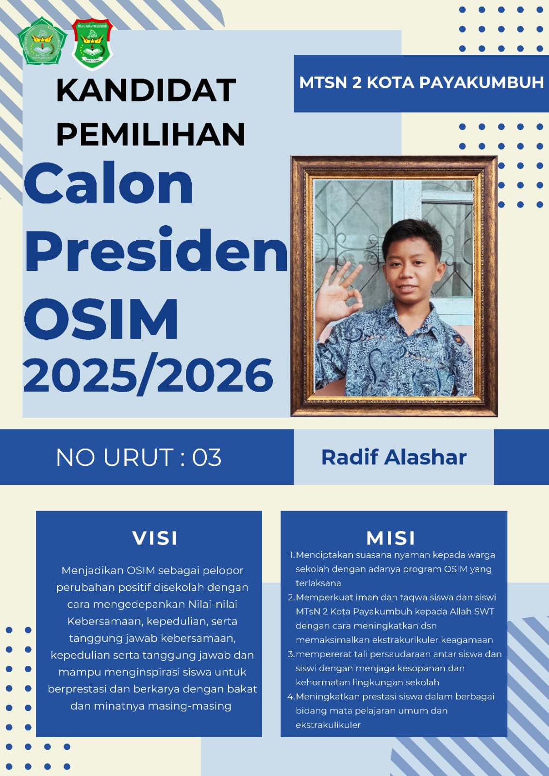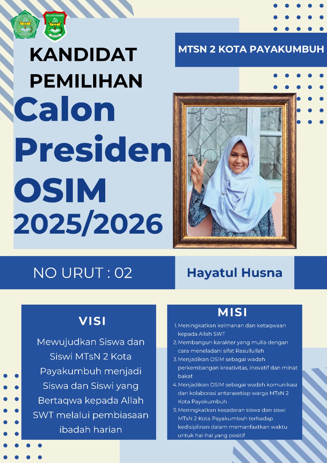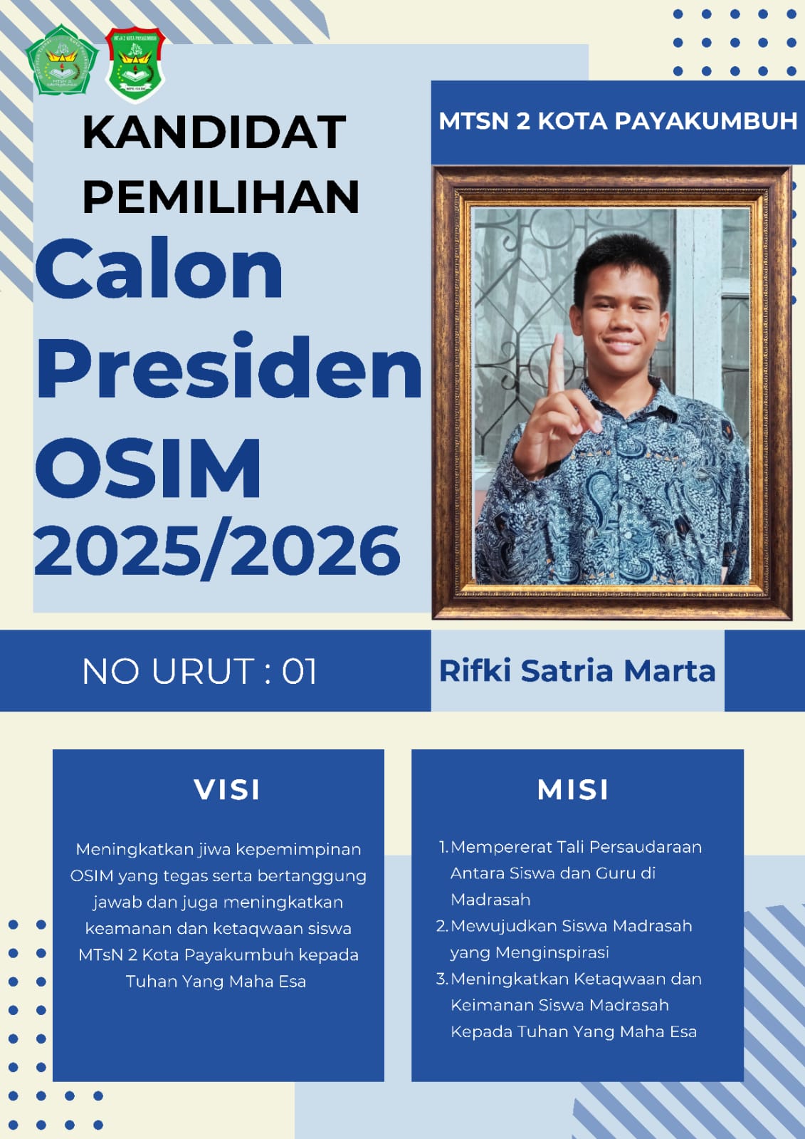Dalam pemilu tahun ini terdapat tiga calon presiden OSIM yang akan memperebutkan kursi kepemimpinan periode 2025–2026, yakni Rifki Satria Marta dari kelas VIII.1, Hayatul Husna dari kelas VIII.9, dan Radif Alashar dari kelas VIII.1. Kehadiran para calon ini diharapkan dapat memberikan warna baru dalam perjalanan OSIM ke depan.