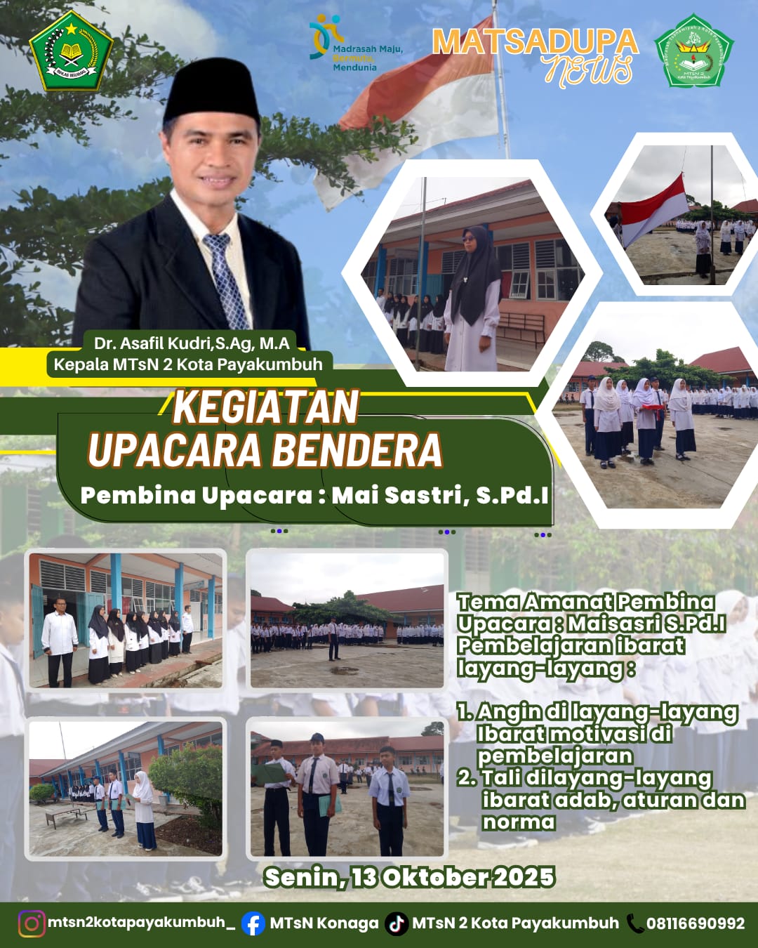 Pada upacara kali ini, yang bertindak sebagai pembina upacara adalah Mai Sastri, guru pendidikan agama Islam MTsN 2 Kota Payakumbuh. Dalam amanatnya, beliau menyampaikan pesan mendalam dengan tema: "Pembelajaran Ibarat Layang-Layang."