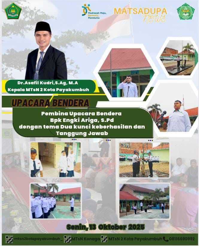 Payakumbuh, 13 Oktober 2025 — Suasana khidmat dan penuh semangat tampak mewarnai pelaksanaan Upacara Bendera yang digelar oleh kelas VII MTsN 2 Kota Payakumbuh, bertempat di lapangan SMA PGRI Payakumbuh. Kegiatan ini merupakan bagian dari agenda rutin sekolah dalam membina karakter siswa sejak dini melalui kegiatan formal yang sarat nilai kedisiplinan dan tanggung jawab.