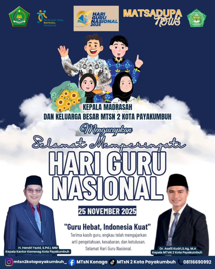 Jasa dan pengabdian para guru akan selalu kami kenang dan menjadi inspirasi bagi seluruh civitas akademika MTsN 2 Kota Payakumbuh. Semoga para guru senantiasa diberikan kesehatan, kekuatan, dan keberkahan dalam menjalankan amanah mulia mencerdaskan kehidupan bangsa.